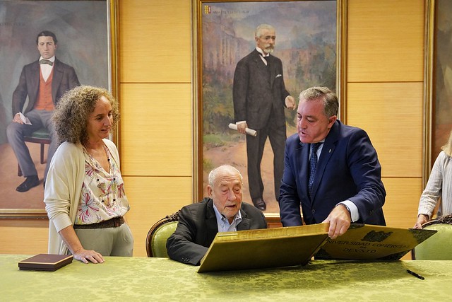 Asimismo, en su visita el Profesor Stiglitz firmó en el Libro de Honor de la DBS y recibió de manos de la Presidenta de la FVA, Fuensanta de Icaza, el medallón conmemorativo de los Hermanos Aguirre, gracias a los cuales su sobrino D.Pedro fundó “La Comercial” en 1916.